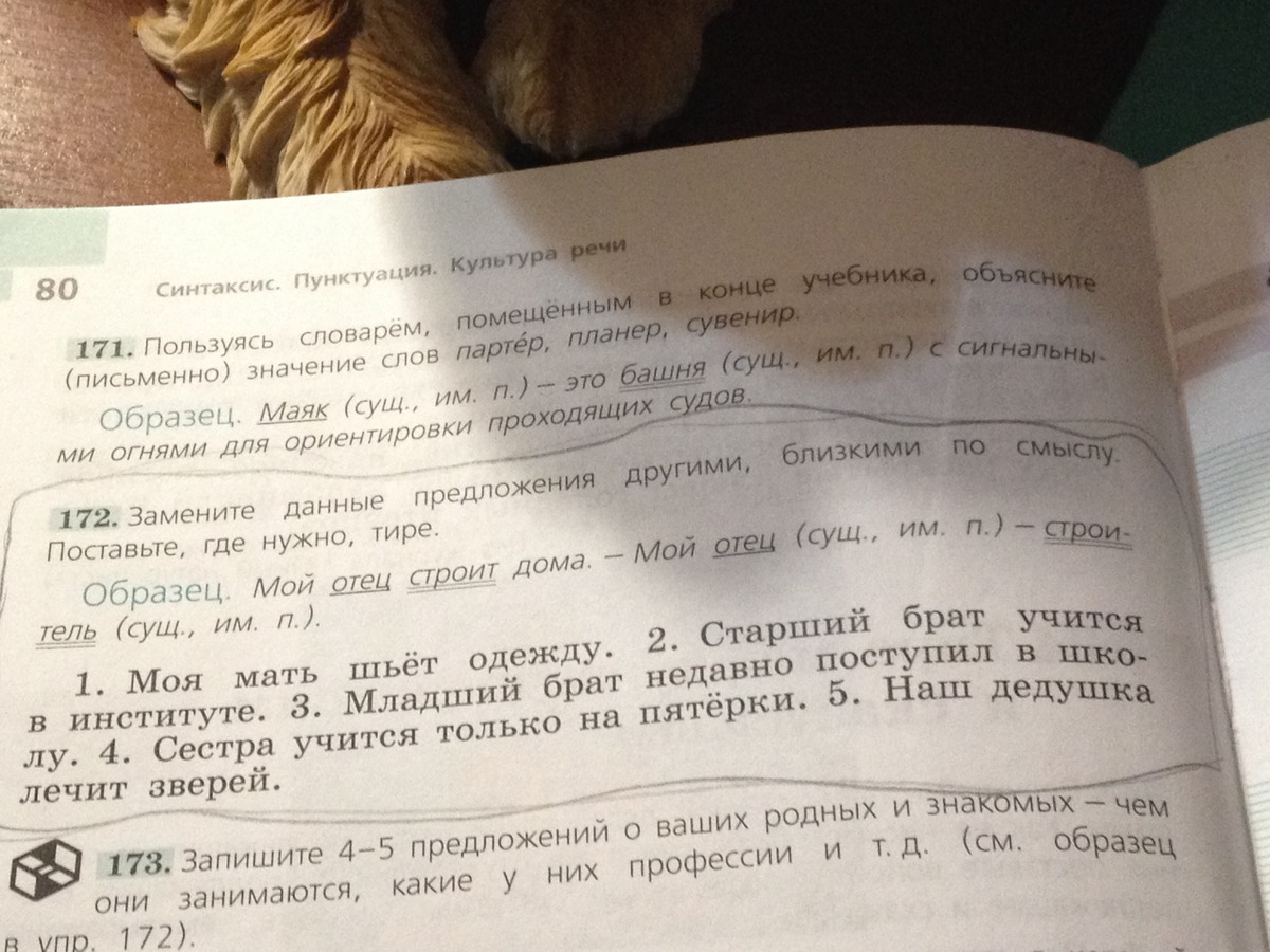 Моя мать шьет одежду-Моя мать швейка. Старший брат учится в институте- Мой брат ученик. Младший брат недавно поступил в школу-Мой младший брат школьник. Сестра учится только на пятерки-Моя сестра отличница. Наш дедушка лечит зверей-Наш дедушка ветеринар! У меня такой же учебник и вот на днях делали это с классом у нас получилось так это легко!! Надеюсь что помогла!