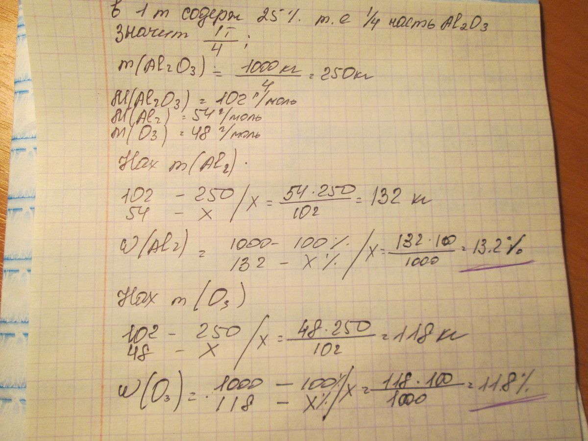В природном боксите содержание оксида алюминия (Al2 O3) составляет 25%.Вычислите массовые доли (%) алюминия и кислорода в 1 т боксита