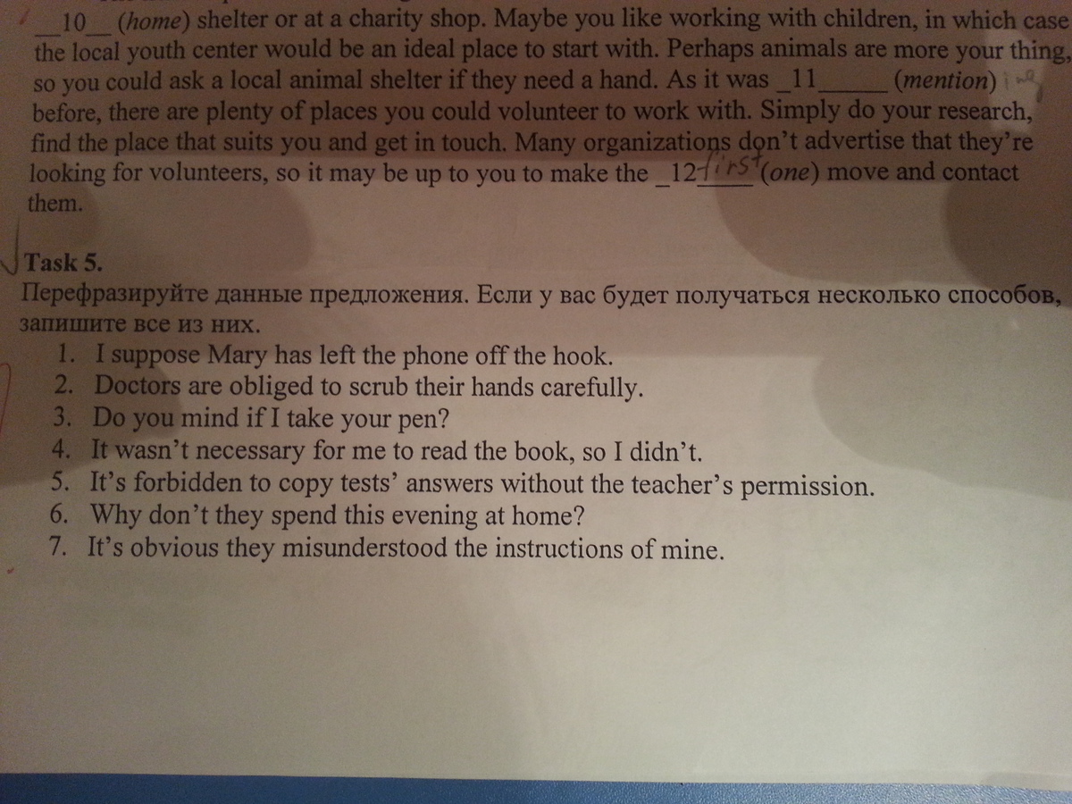 10 (home) shelter or at a charity shop. Maybe you like working with children, in which case the local youth center would be an ideal place to start with. Perhaps animals are more your thing, so you could ask a local animal shelter if they need a hand. As it was 11 (mention) before, there are plenty of places you could volunteer to work with. Simply do your research, • find the place that suits you and get in touch. Many organizatiops dyn't advertise that they're looking for volunteers, so it may be up to you to make the -12- (one) move and contact them.