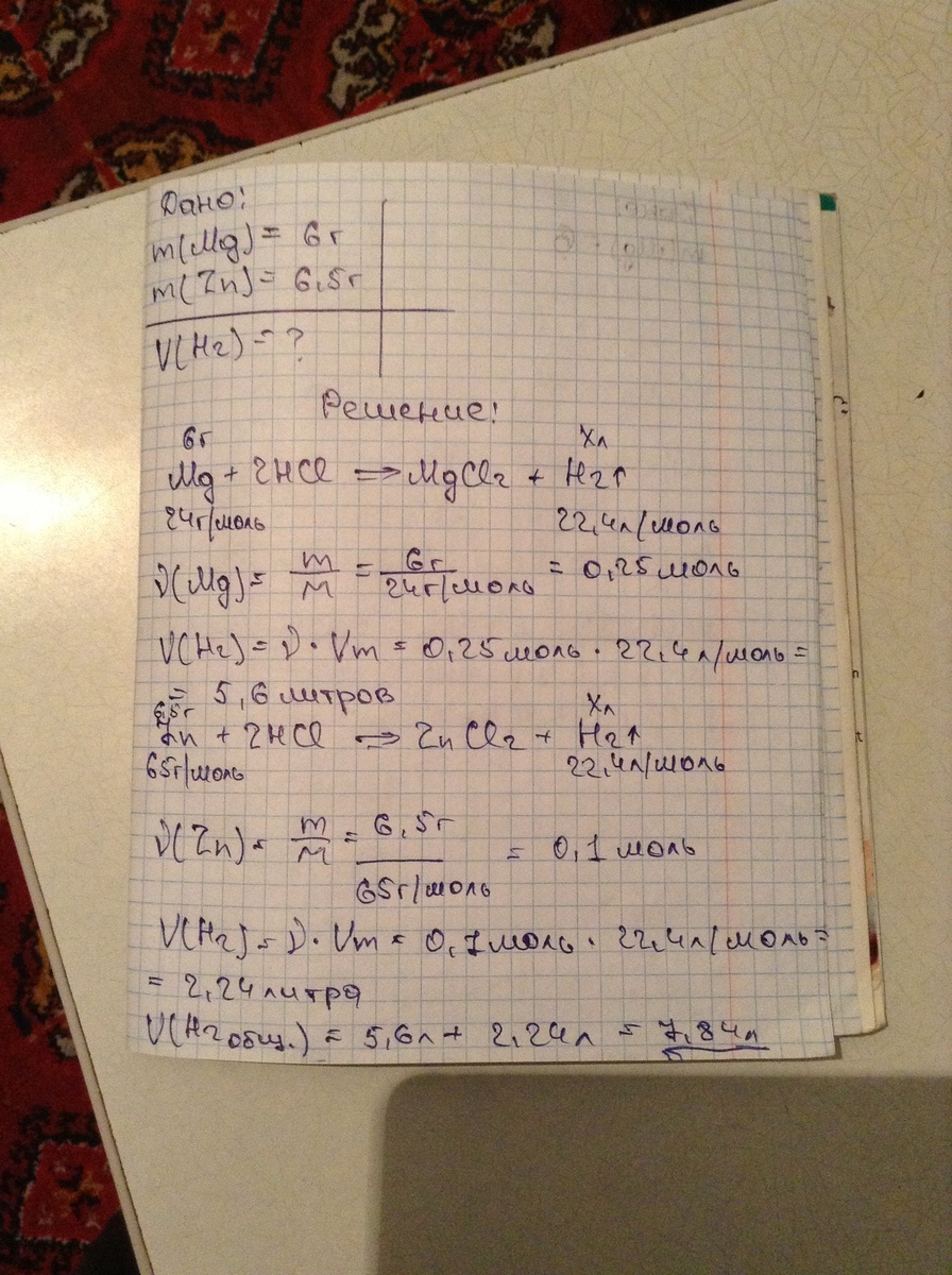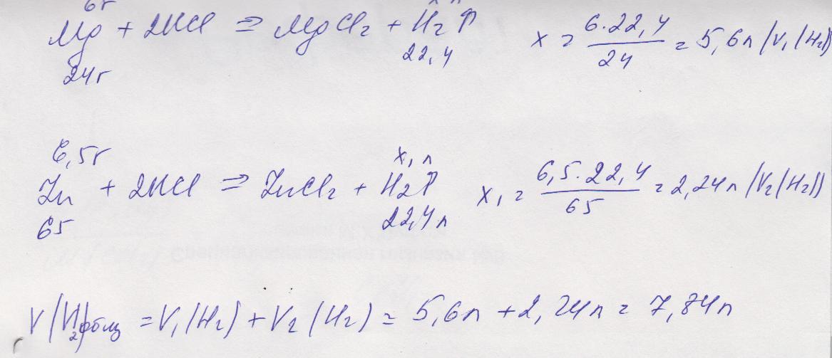 В избытке соляной кислоты растворили магний 6 г и цинк массой 6,5 г . Какой объём водорода,измеренный при нормальных условиях выделится при этом?