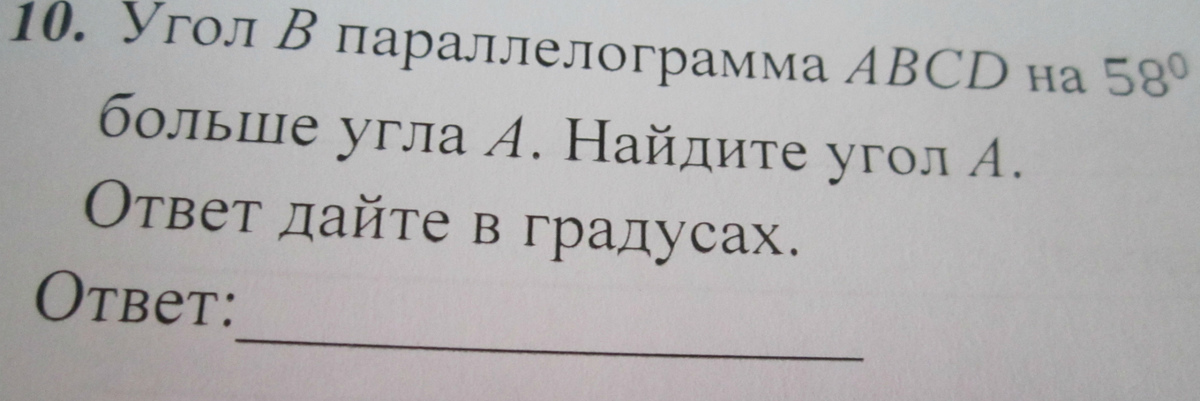 Угол B параллелограмма ABCD на 58 градусов больше угла A. Найдите угол A. Ответ дайте в градусах.