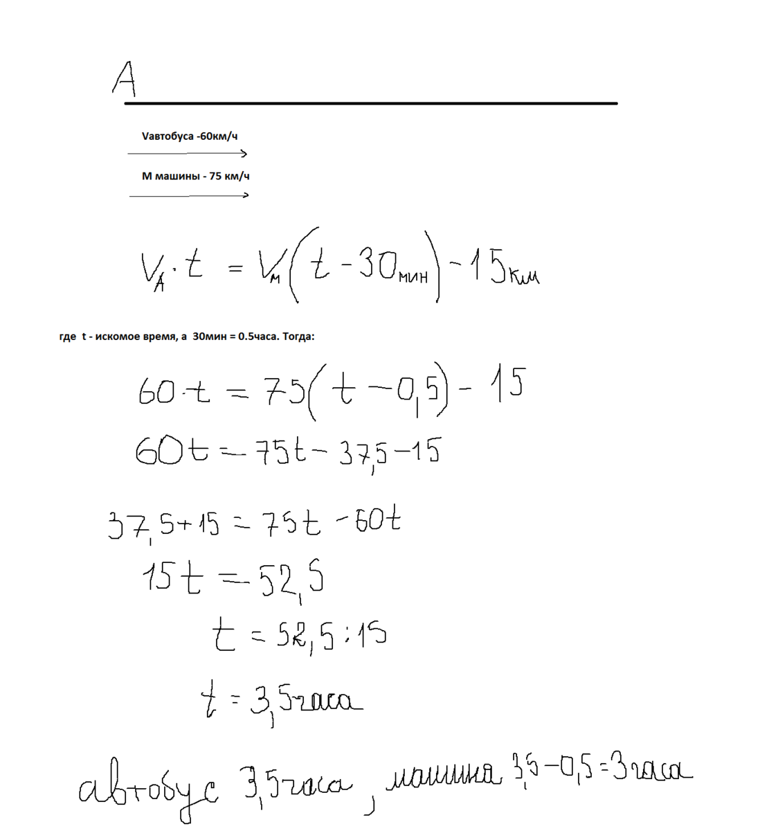В 12ч от автовокзала отошёл автобус со скорость 60кмч А через полчаса вслед за ним выехала машина со скоростью 75кмч. Через сколько часов после своего выезда машина обгонит автобус на 15км