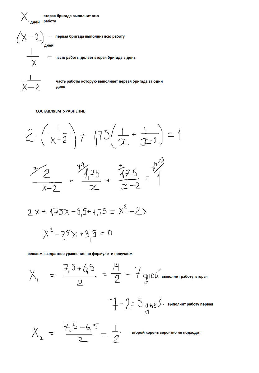 выполнение задания было поручено двум бригадам. После того как первая бригада проработала 2 дня, работе приступила вторая бригада. И через 1 3/4 дня они вместе выполнили задание.За сколько дней это задание могла бы выполнить каждая бригада, работая отдельно, если первой потребуется на это на 2 дня менше?