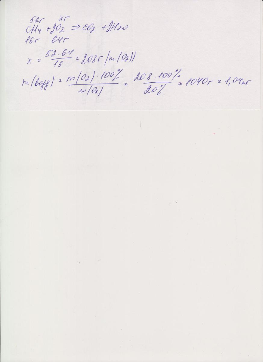какая масса воздуха понадобится для полного сгорания 52 г метана CH4( в воздухе содержится примерно 20 процентов кислорода)?