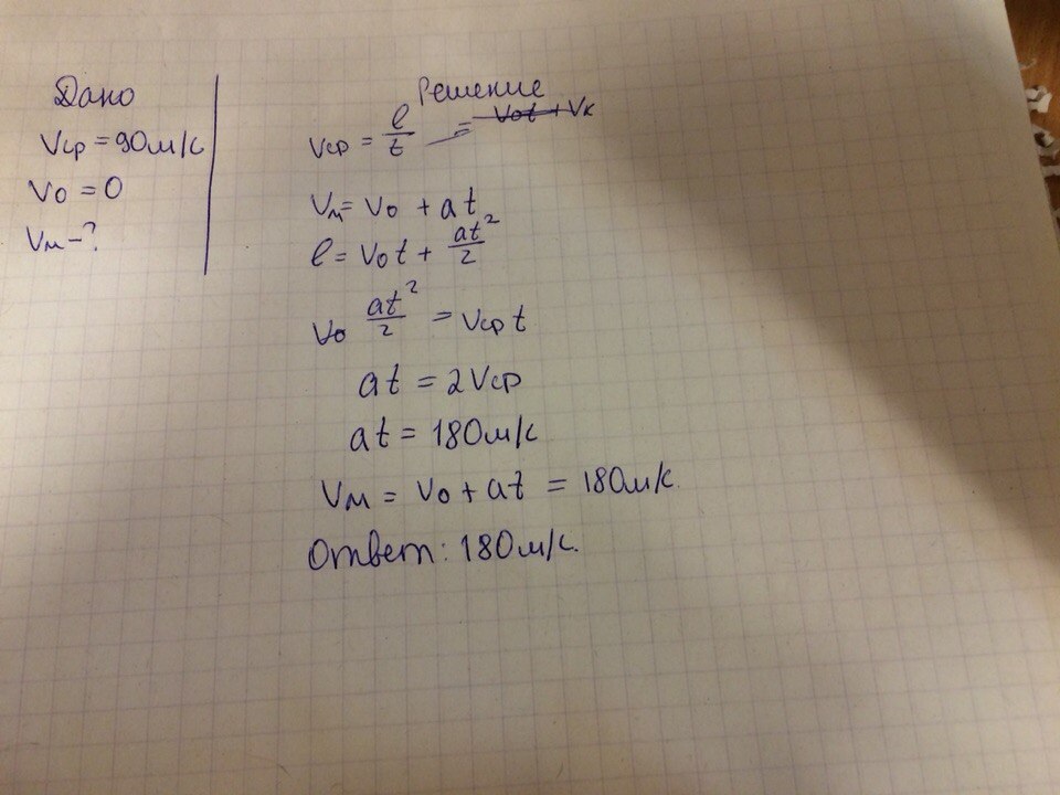 шоссе со средней скоростью 90 м/с. Начальная скорость движения равно нулю. Чему равно мгновенная скорость мотоциклиста в конце участка шоссе?
