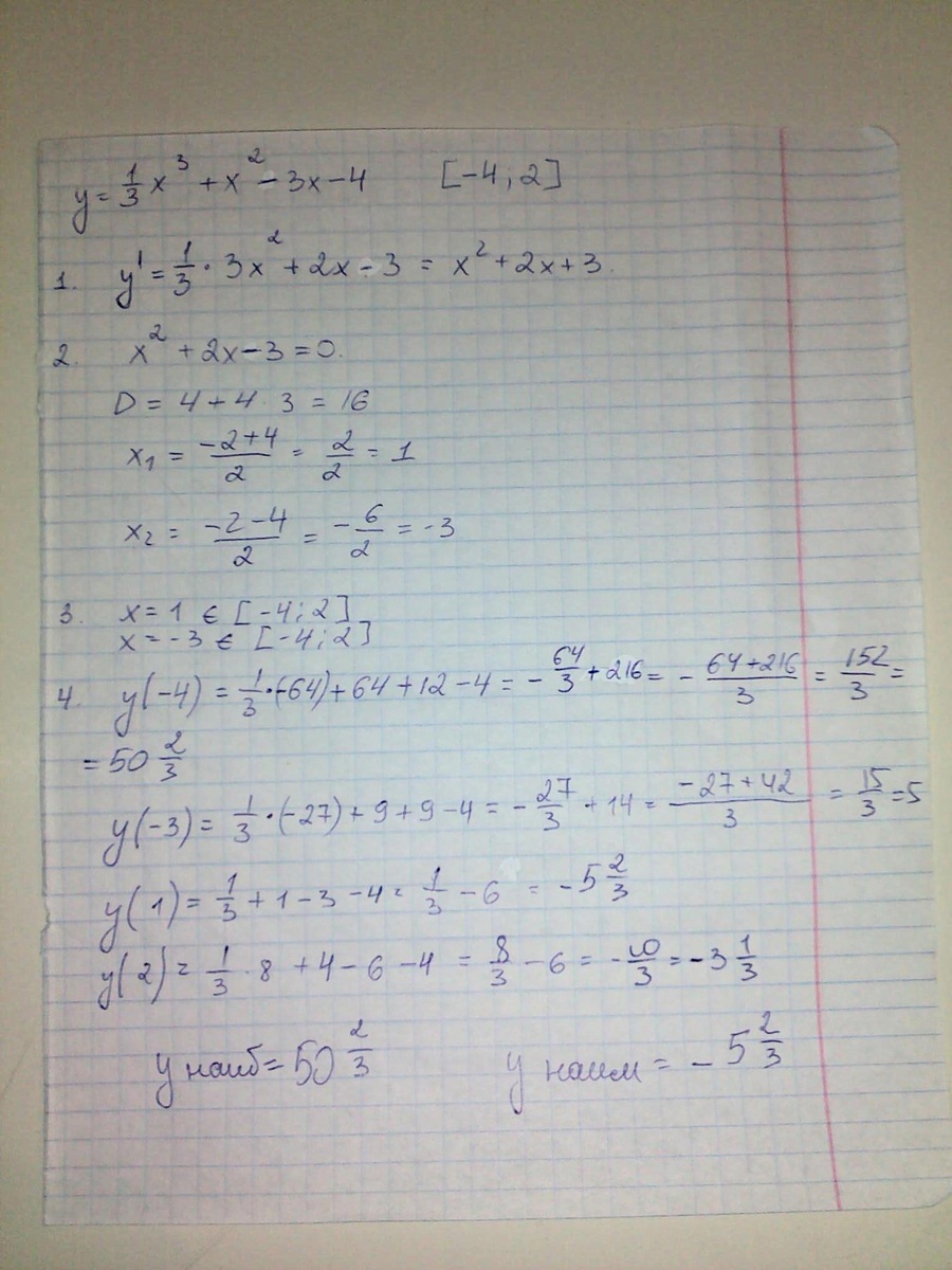 Найдите наименьшее и наибольшее значение функции y=1/3x^3+x^2-3x-4 на отрезке -4 < или = x < или = 2