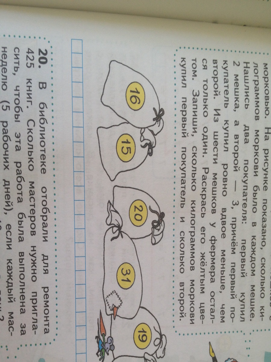 Фермер привёз на рынок 6 мешков с морковью. На рисунке показано, сколько килограммов моркови было в каждим мешке. Нашлись два покупателя: первый купил 2 мешка , а второй-3, причём первый покупатель купил ровно вдвое меньше, чем второй. Из шести мешков у фермера остался только 1. Надо оаскрасить его желтым цветом. И записать сколько кг купил каждый покупатель!