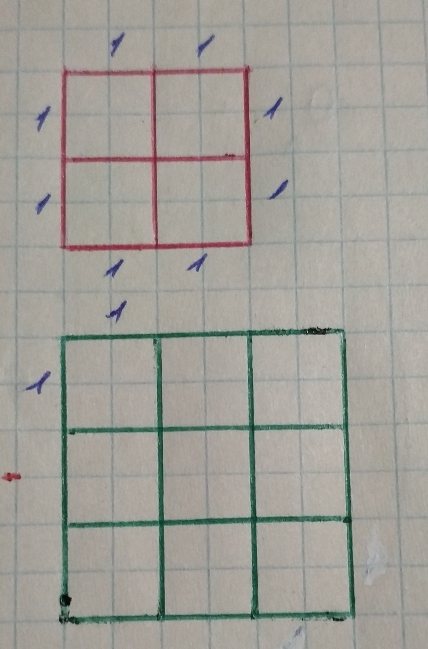 Начерти два квадрата: один со стороной 2 см,другой со стороной 3 см.Разбей каждый квадрат на квадратные сантиметры и найди его площадь.