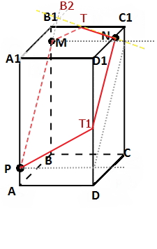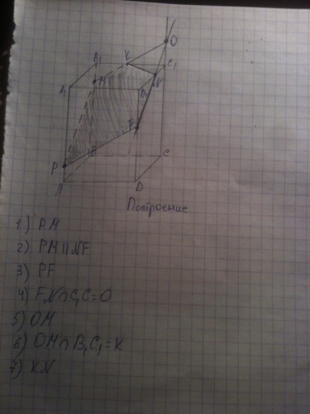 2) нужно построить точку пересечения прямых РМ и А1В1, т.к. А1В1 принадлежит плоскостям (АВВ1) и (А1В1С1), а точка N лежит в (А1В1С1)