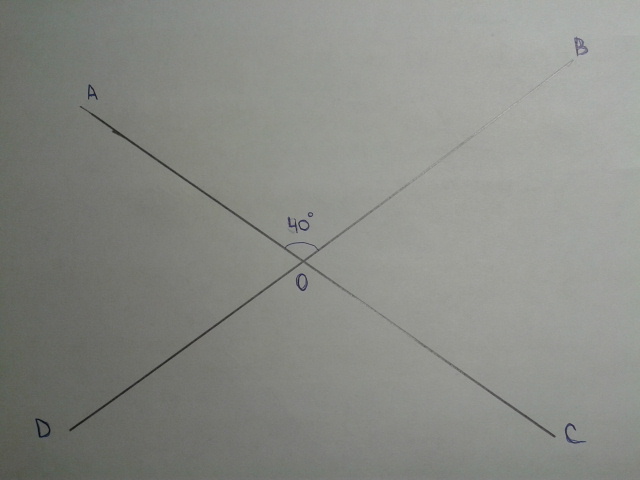 угол AOB и угол DOC - как вертикальные т.к вертикальные углы равны следовательно угол AOB = углу DOC = 40