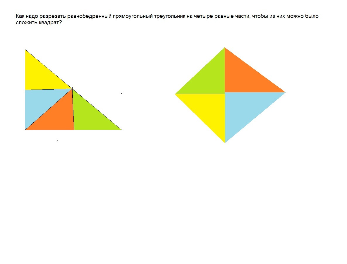 Как надо разрезать равнобедренный прямоугольный треугольник на четыре равные части,чтобы из них можно было сложить квадрат.