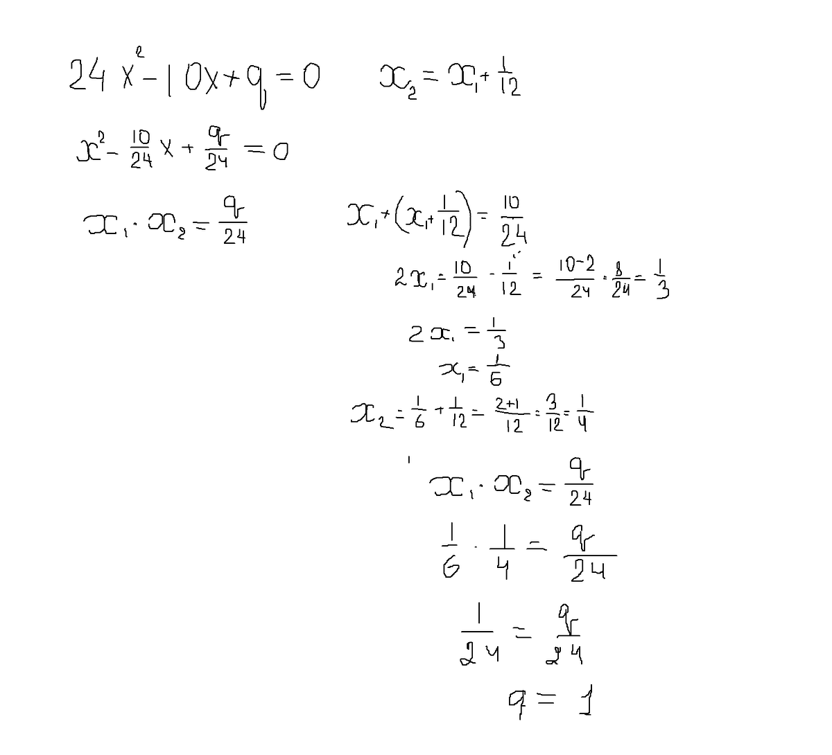 "Один из корней квадратного уравнения 24x^2 - 10x + q = 0 на 1/12 больше другого. Найдите q"