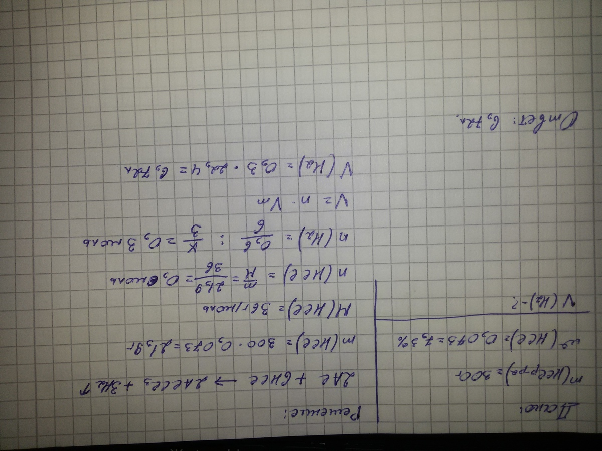 Ну сотри здесь(m(HCl)=300*0.073=21.9 г) мы нашли массу соли зная наш раствор и процентное содержание соли.Дальше вот здесь(Mr(HCl)=36.5г/моль) мы нашли молярную массу хлороводорода.Потом я (у меня в решении я нашел химическое количество хлороводорода) и по пропорции нашел хим.количество водорода.У другого пользователя он составил также пропорцию но более обьемную