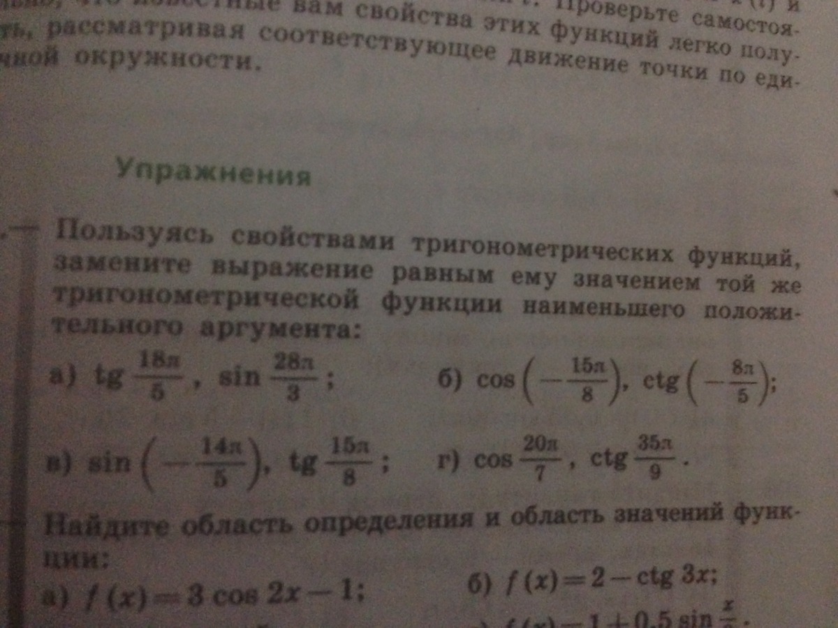 а) tg18П/5 ; sin28П/3. б) cos(-15П/8) ; ctg(-8П/5). в) sin(-14П/5) ; tg(15П/8). г) cos20П/7 ; ctg35П/9