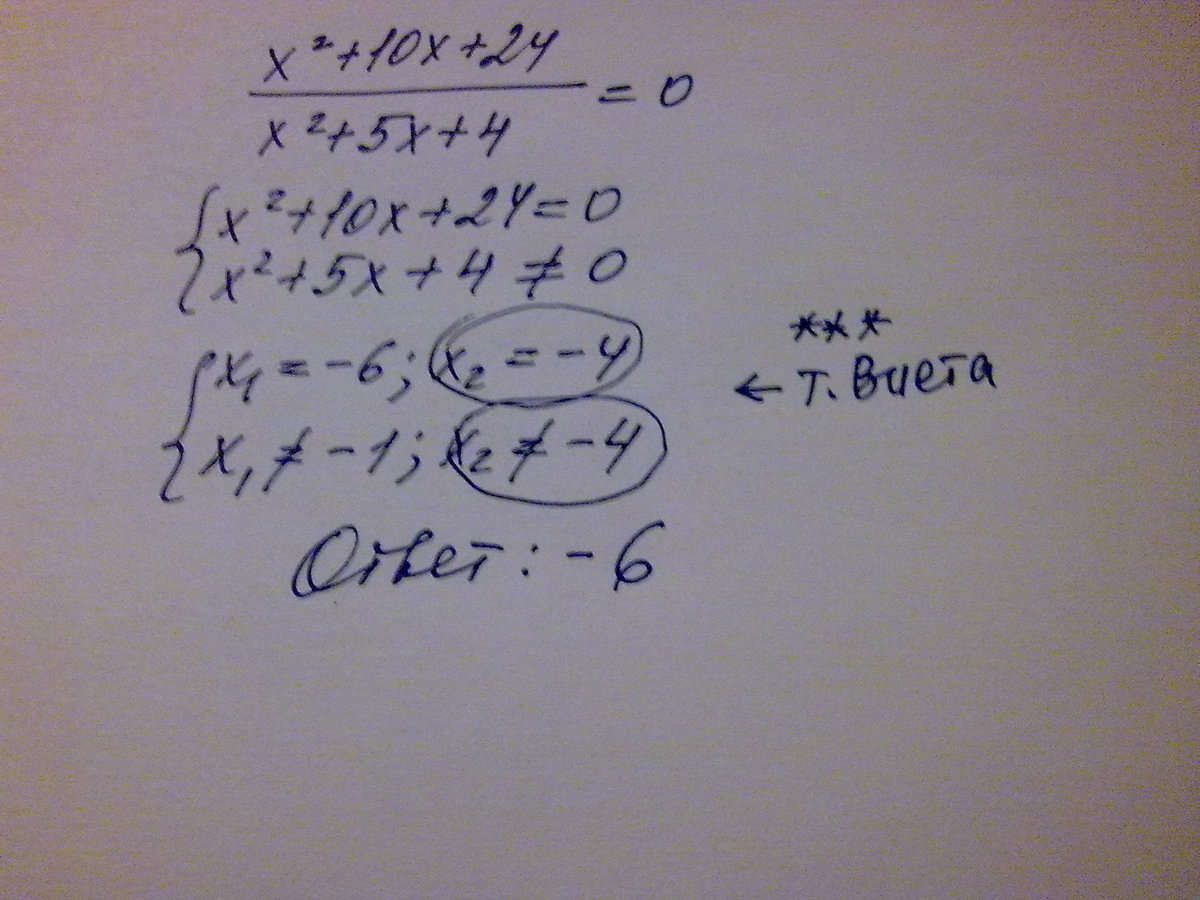 х в квадрате +10х + 24 деленное на х в квадрате +5х + 4 = 0