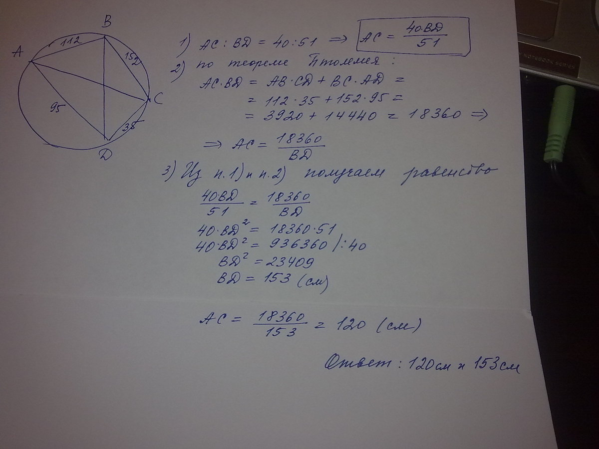 ПРОШУ ,ПОМОГИТЕ! МАТЕМАТИКА 9 КЛАСС.: последовательные стороны четырехугольника,вписанного в окружность,равны 112 см,152 см,35 см,95 см. Найдите диагонали четырехугольника,учитывая,что они относятся как 40:51.