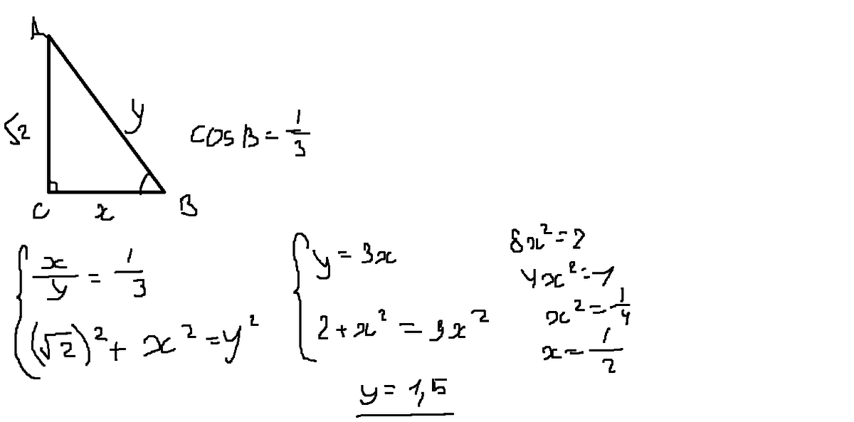1. В треугольнике ABC угол C равен 90, АС = √ 2, соsB= 1/3. Найдите АВ.