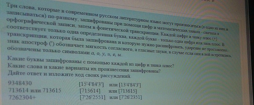 ПОЖАЛУЙСТА!!!!!!!!!!!!!!!!!!! СРОЧНО!!!!!!!!!!!!1 ОЧЕНЬ НУЖНО!!!!!!!! Три слова, которые в современном русском литературном языке могут произноситься (а одно из них и записываться) по-разному, зашифрованы при помощи цифр и математических знаков - сначала в орфографической записи, затем в фонетической транскрипции. Каждой цифре и знаку плюс (+) соответствует только одна определенная буква, каждой букве - только одна цифра или знак плюс. В транскрипции, которая была зашифрована и которую нужно расшифровать, ударение не проставлено, знак апостроф ('