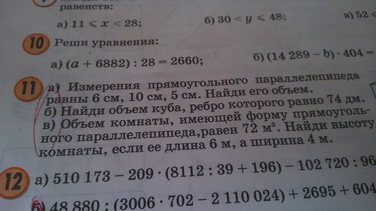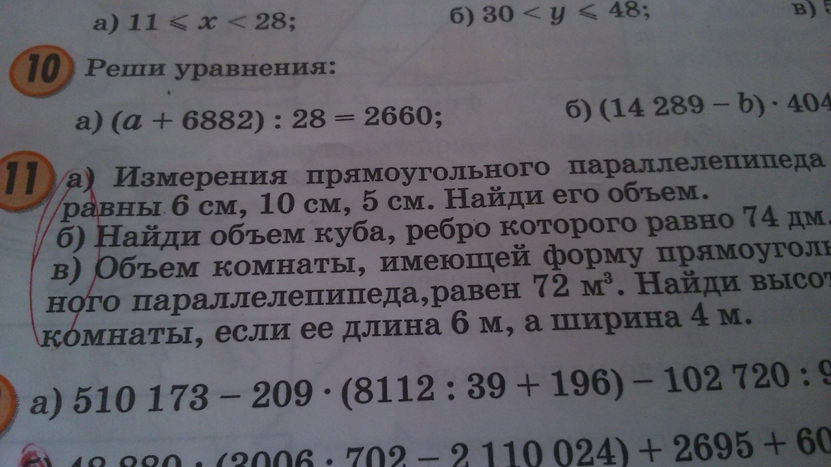 3. Т.к. V=a*b*c, то c=V/(a*b)=72/(6*4)=3 м