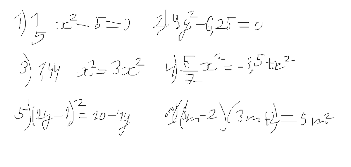 2)9y ^{2}= frac{25}{4}Rightarrow  y^{2} = frac{25}{36} ,  \ y_{1} = -frac{5}{6}; \ y_{2}= frac{5}{6} \ 3)1,44=4 x^{2} Rightarrow  x^{2} = frac{1,44}{4}\x_{1} =- frac{1,2}{2}=-0,6 ; \ x_{2} =frac{1,2}{2}=0,6.  \ 4) frac{5}{7}  x^{2} =-3,5+ x^{2} , \ frac{5}{7}  x^{2}- x^{2}  =-3,5 \ -  frac{2}{7}  x^{2} =-3,5 \  x^{2} = frac{49}{4} \  x_{1} =- frac{7}{2}=-3,5 ; \ x_{2} =frac{7}{2}=3,5.