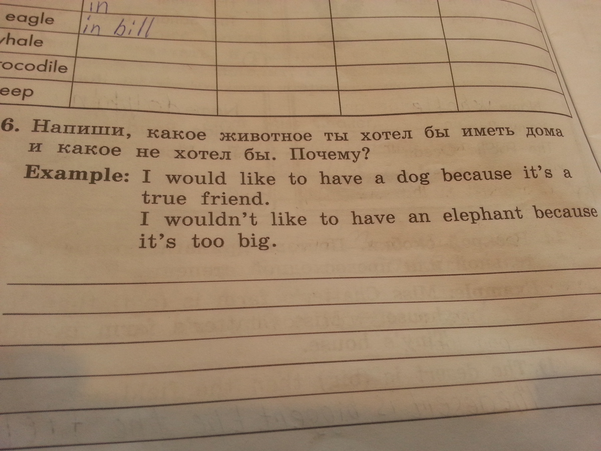 Мне бы хотелось иметь попугая, потому что он очень красивый и умеет разговаривать. Мне не хотелось бы иметь тигра. потому что он слишком опасный.