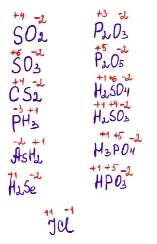 определить степень окисления элементов в следующих соединениях SO2, SO3,CS2,PH3, AsH2, H2Se, P2O3, P2O5, H2SO4, H2SO3, H3PO4, HPO3, ICI.