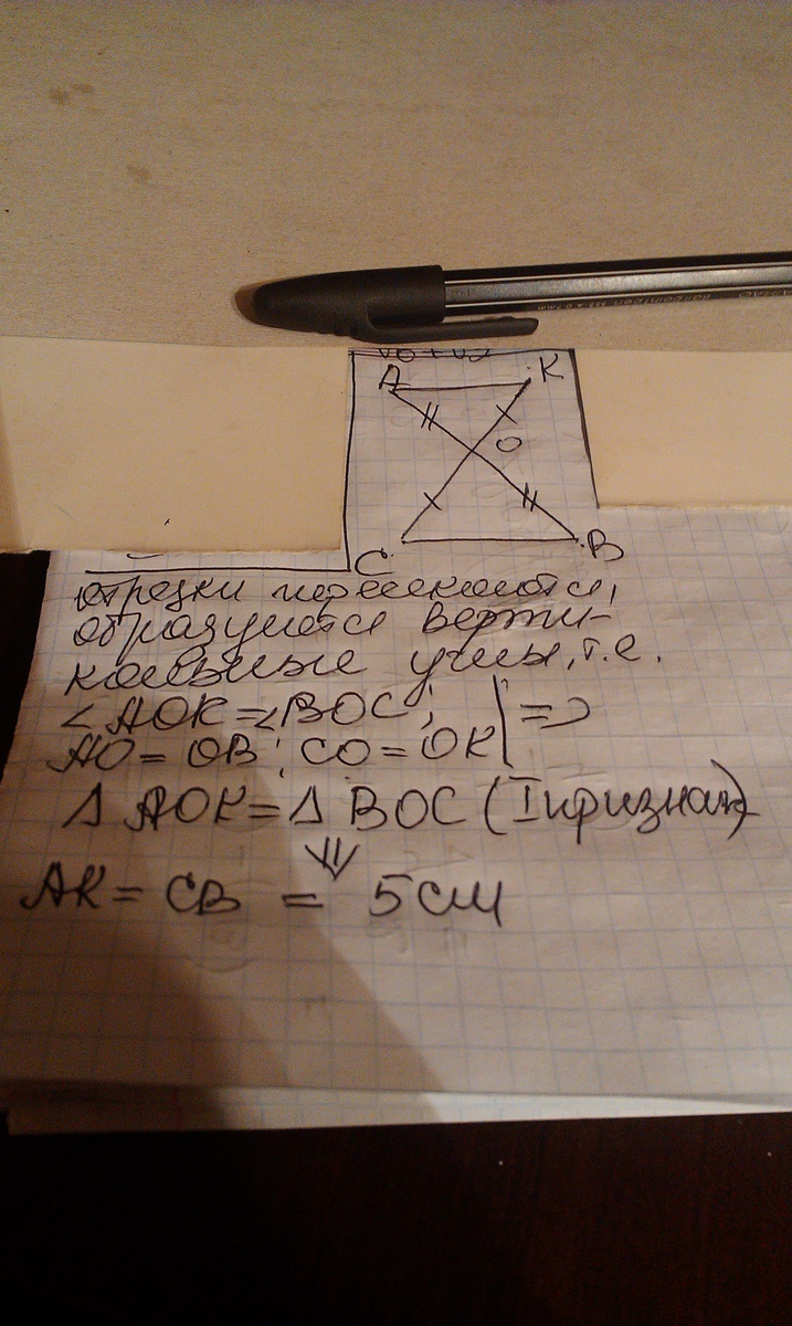 Геометрия. Отрезки AB и CK пересекаются в точке O, и точкой пересечения делятся пополам. Известно, что AB=6, CK=8, AK=5. Найдите BC.