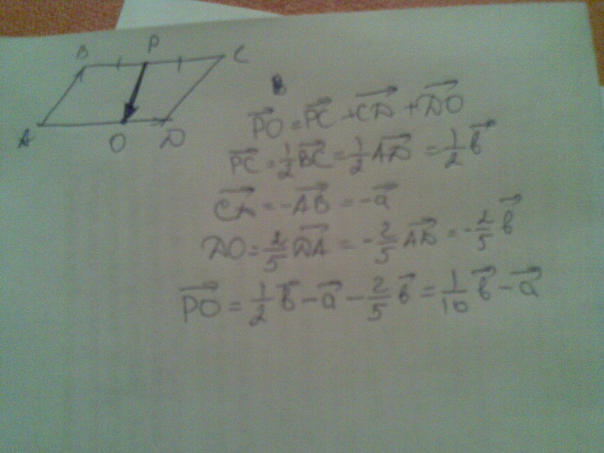 точка Р и О лежат соответственно на сторонах АД и ВС параллелограмма АВСД; ВР=РС, АО:ОД=3:2. выразите вектор РО через векторы а=вектору АВ и вектор в=вектору АД