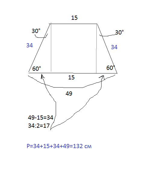 Складываем все стороны. Верхнее основание = 15см, нижнее 49см. Находим боковые части нижнего основания = (49-15)/2=17 (с обоих сторон). Проводим высоту и получаем угол 90 градусов, значит угол у верхнего основания получившегося прямоугольного треугольника равен 30 градусов. Мы знаем, что сторона, лежащая напротив угла в 30 градусов равно половине гипотенузы. Значит, чтобы получить боковую сторону мы 17*2=34 см. Считаем P=34+34+15+49=132 см.