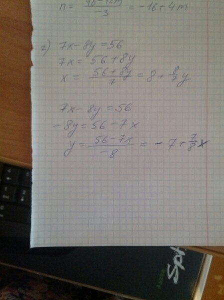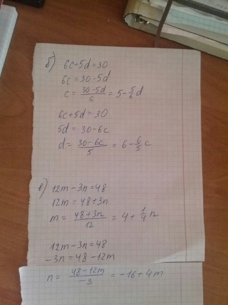 Дано линейное уравнение с двумя переменными.Используя его,выразите каждую из переменных через другую. а)3a+8b=24 б)6c+5d=30 в)12m-3n=48 г)7x-8y=56