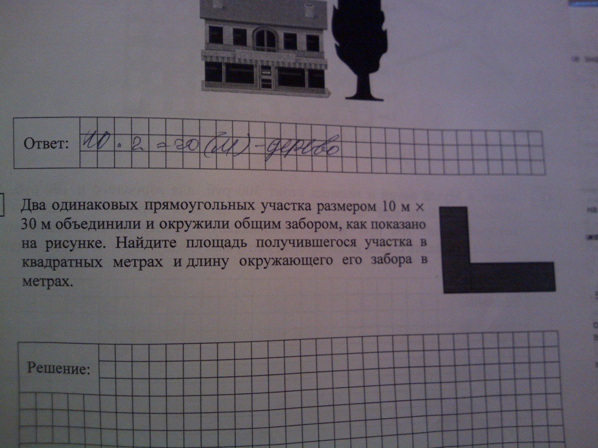 два одинаковых прямоугольных участка размером 10 метров на тридцать метров объединили и окружили общим забором, как показано на рисунке. найдите площадь получившегося участка в квадратных метрах и длину окружающего его забора в метрах