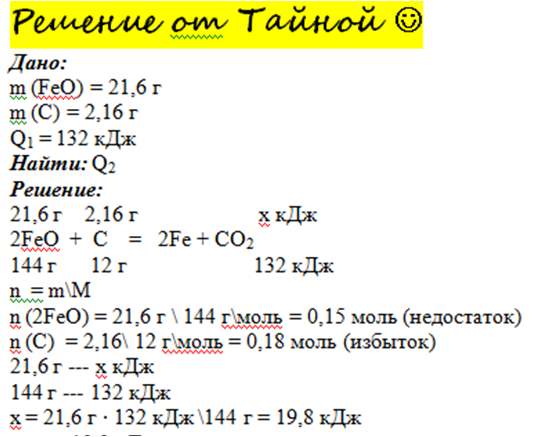 Сколько теплоты поглотится при взаимодействии 21,6 г оксида железа(II) И 2,16 г углерода?
