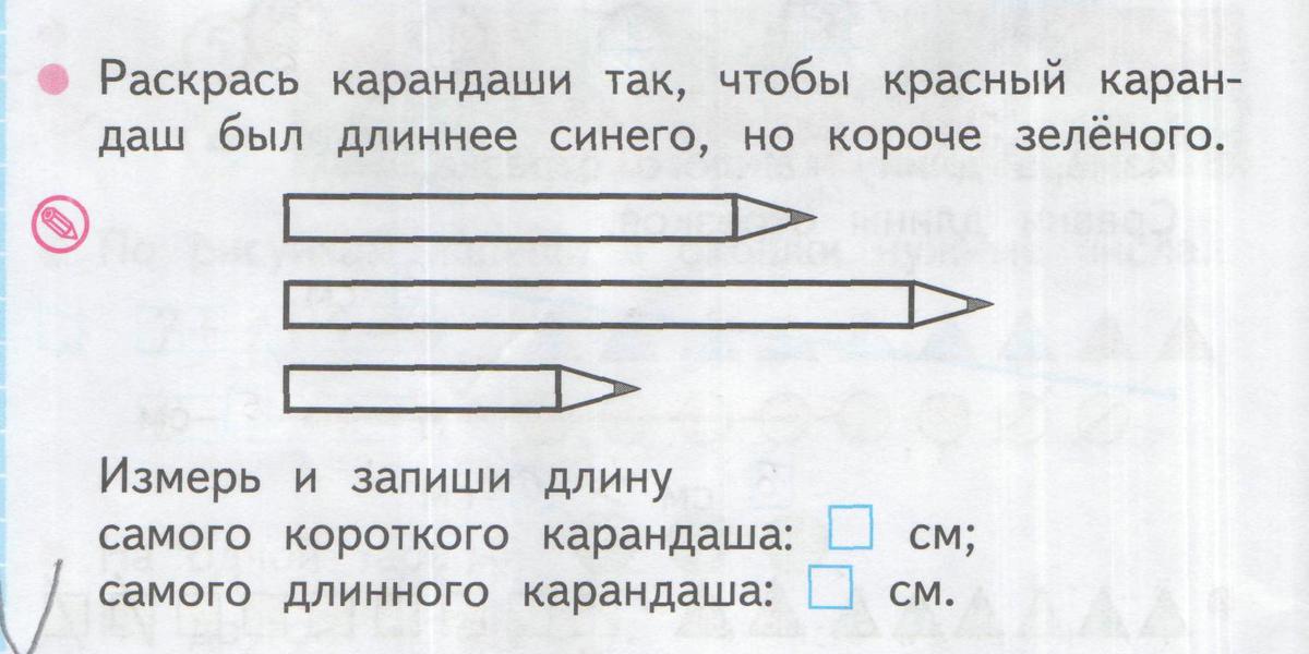 Раскрась карандаши так, чтобы красный карандаш был длиннее синего, но короче зеленого.