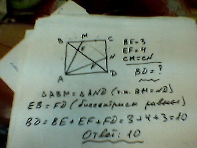 3 на диагонали BD квадрата ABCD взяты точки E и F так что прямая AE пересекает сторону BC в точке M а AF пересекает сторону CD в точке N и CM=CN Найдите длинну диагонали квадрата если BE=3 EF=4