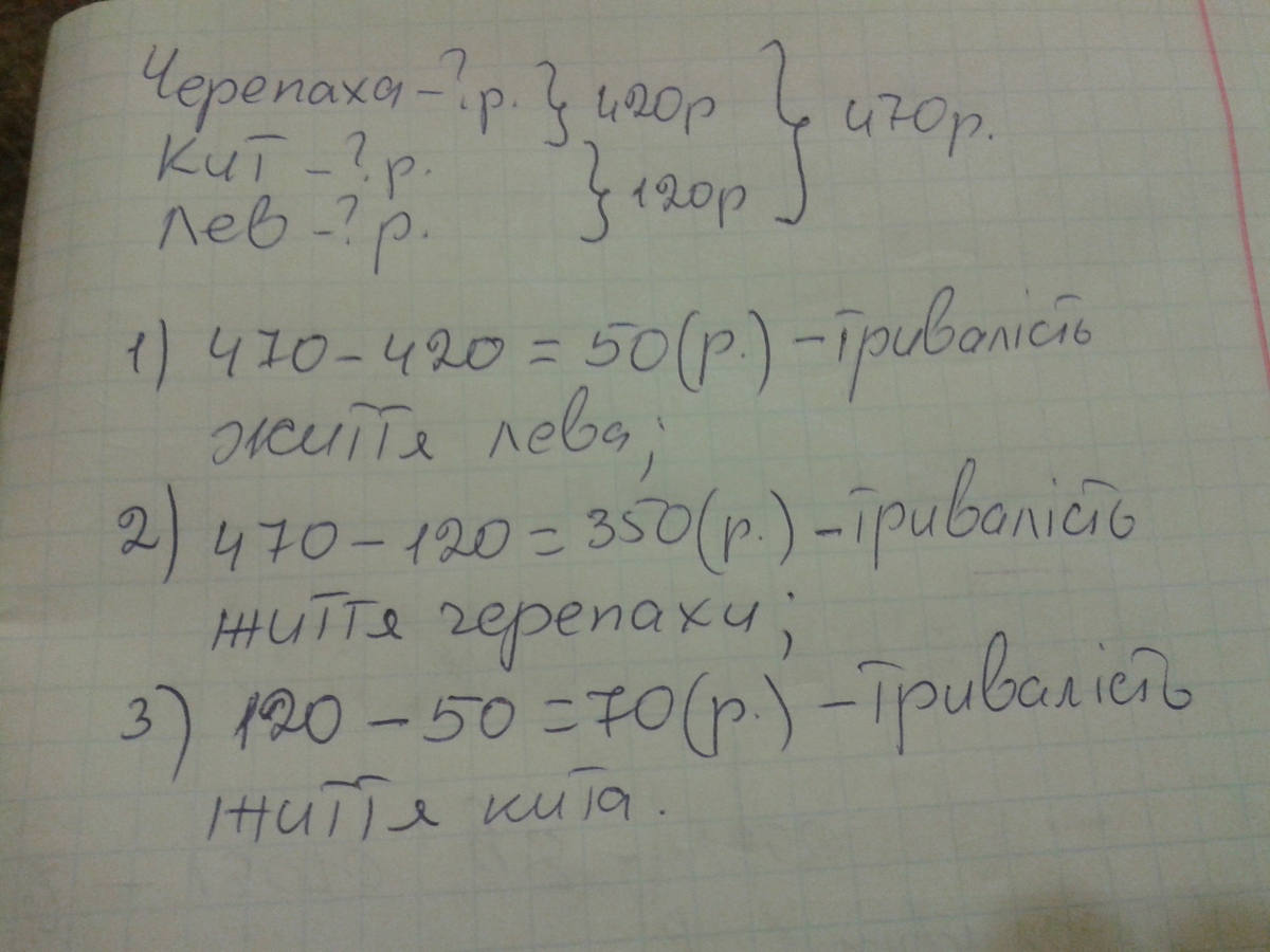 Склади та розв'яжи з поясненням задачу про тривалість життя тварин за коротким записом. Черепаха-? Кит-? Лев-? (черепаха та кит разом 420р.)