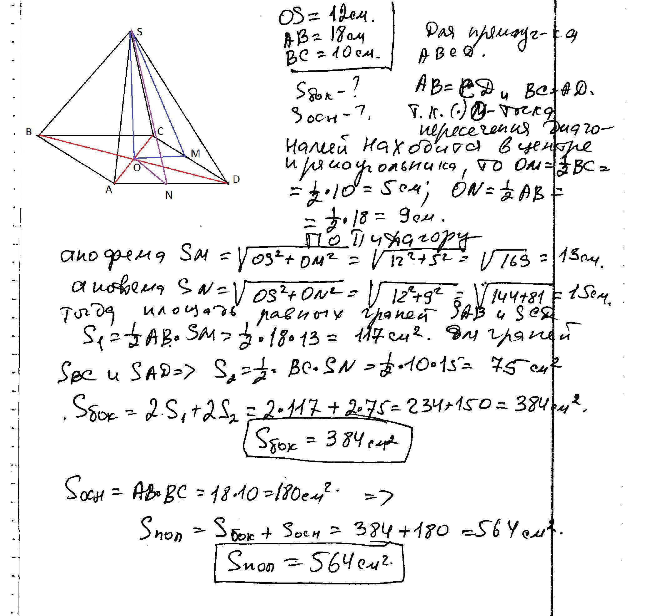 основанием пирамиды является прямоугольник со сторонами 18 см и 10 см. основанием высоты пирамиды, равной 12см, является точка пересечений диагоналей прямоугольника. 1) найдите площадь боковой поверхности пирамиды ; 2)найдите площадь полной поверхности пирамиды.