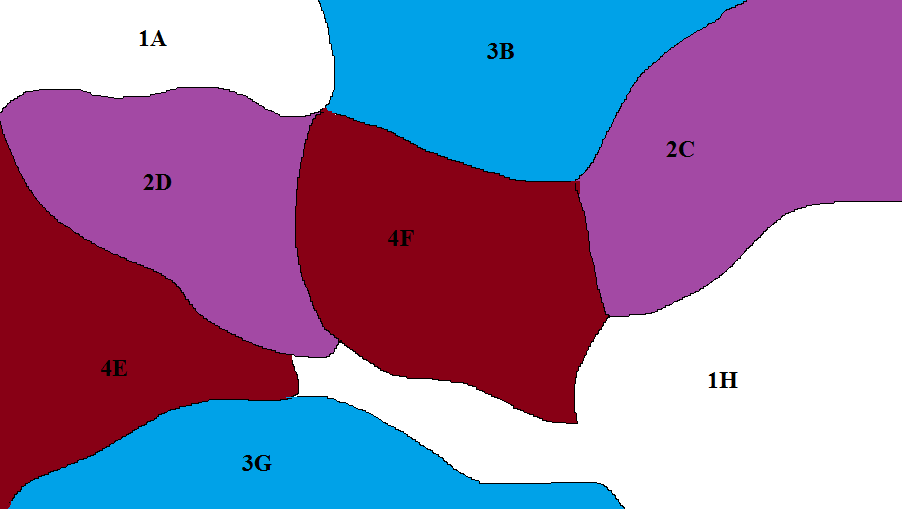 он решил залить лист одним цветом. В редакторе есть инструмент "Залить здесь", который позволяет менять цвет области на выбранный кликом по ней. Для инструмента определены 4 цвета (1,2,3,4 на карте), которые активируются кликом на панели цветов. В начальный момент времени выбран инструмент "Залить здесь", для которого активен белый цвет. После каждого использования инструмента Знайка должен менять цвет на ранее НЕиспользовавшийся. Области с общим участком границы, у которых совпали цвета, далее рассматриваются как одна область. За какое минимальное количество кликов Знайка перекрасит карту в один цвет.