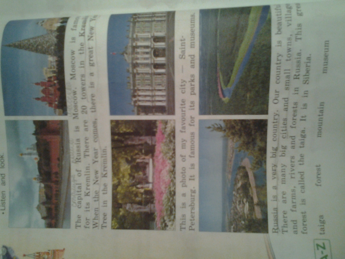 Россия-очень большая страна. Наша страна прекрасна.В России много больших и маленьких городов,деревень и ферм, рек и лесов.Этот большой лес называется тайга. Это в Сибири.