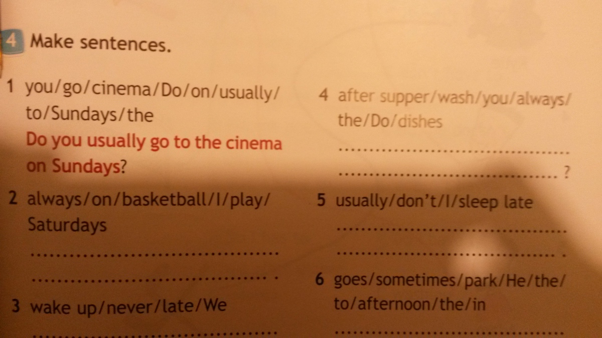 1)I always play basketball on Saturdays. 2)We never wake up late. 3)Do you always wash the dishes after supper. 4)I don't usually sleep late 5)He sometimes goes to the park in the afternoon