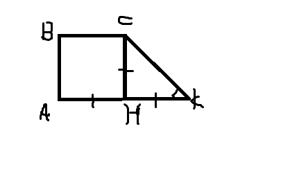 в прямоугольной трапеции ABCK большая боковая сторона равна 3 корня из 2 см , угол K равен 45 градусов , а высота CH делит основание AK пополам . Найдите площадь трапеции