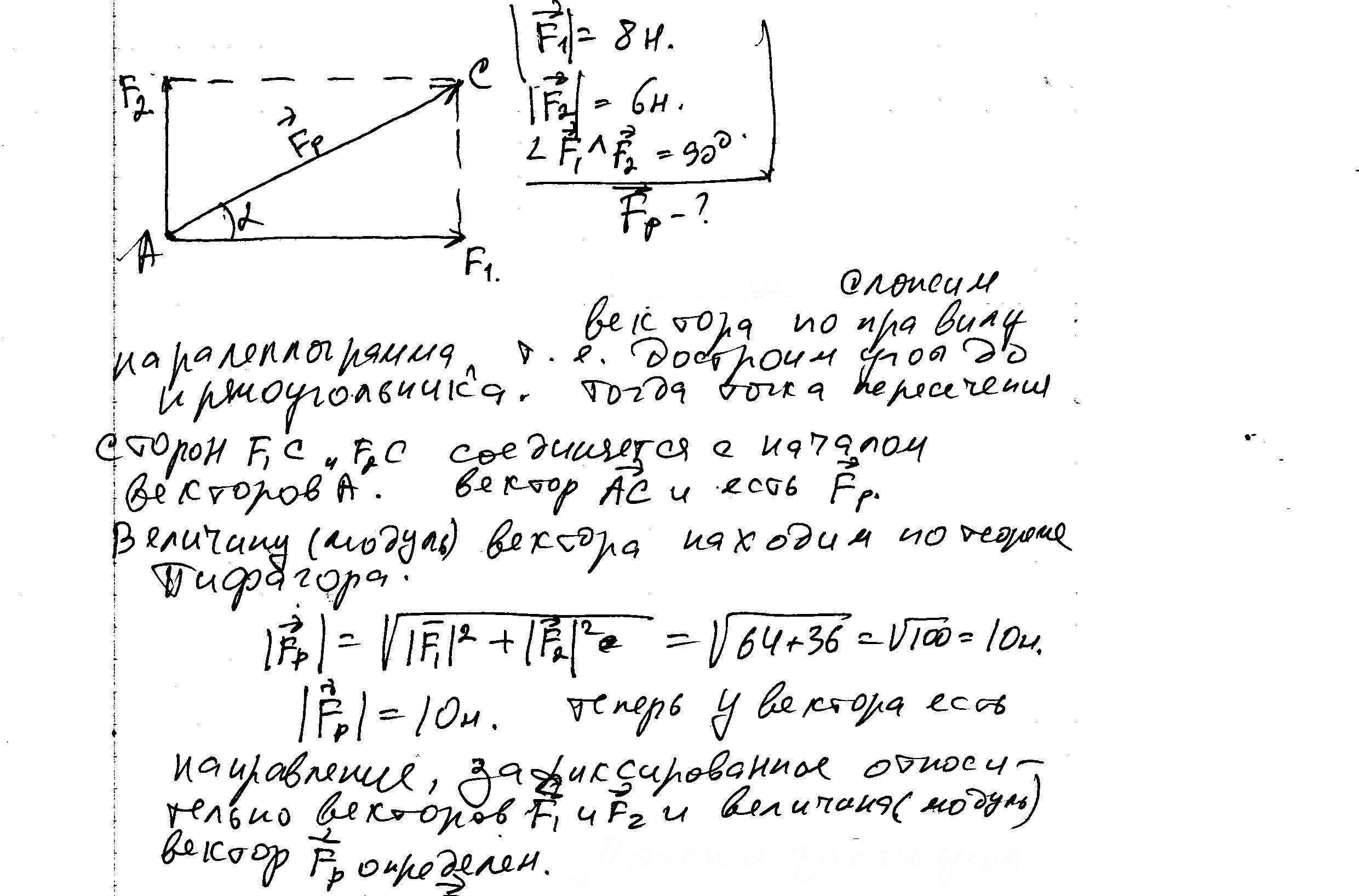 Две силы, соответствующие 8,0 и 6,0 H, действуют на одно тело. Угол между Направлениями сил 90градусов. Найдите равнодействующую этих двух сил.