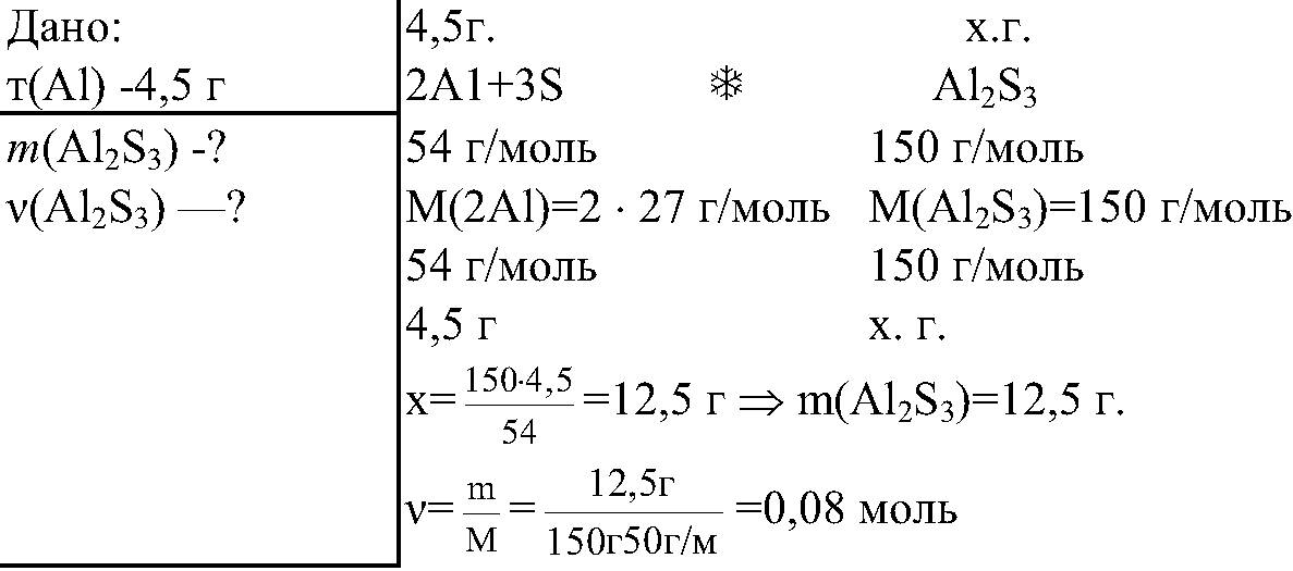 По уравнению 2Al+3S -> Al2S3 найдите массу и кол-во сульфида алюминия Al2S3 если в реакцию вступает 4,5 г алюминия.