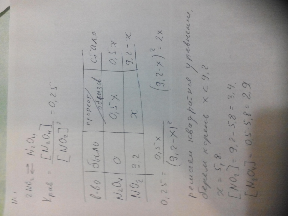 1. Константа равновесия реакции 2NO2 = N2O4 при некоторой температуре равна 0,25. Вычислите концентрации компонентов системы при наступлении равновесия, если первоначальная концентрация [NO2] равна 9,2 г/моль.