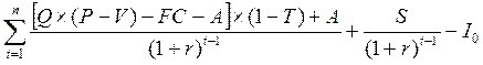 NPV = ЧДП*[1-(1+r)-n/r] + Sn/(1+ r)n - Io , (примечание: -n, это возведение в степень)