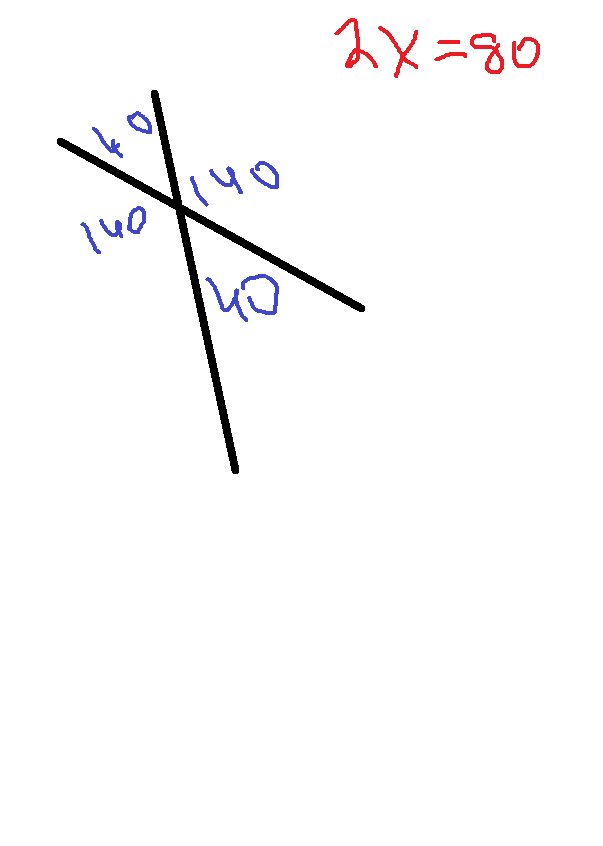 Тыкс,ну т.к. сумма углов по одной прямой не может быть 80 градусов,значит,это 2 одинаковых угла. Вертикальные углы равны. 2х=80