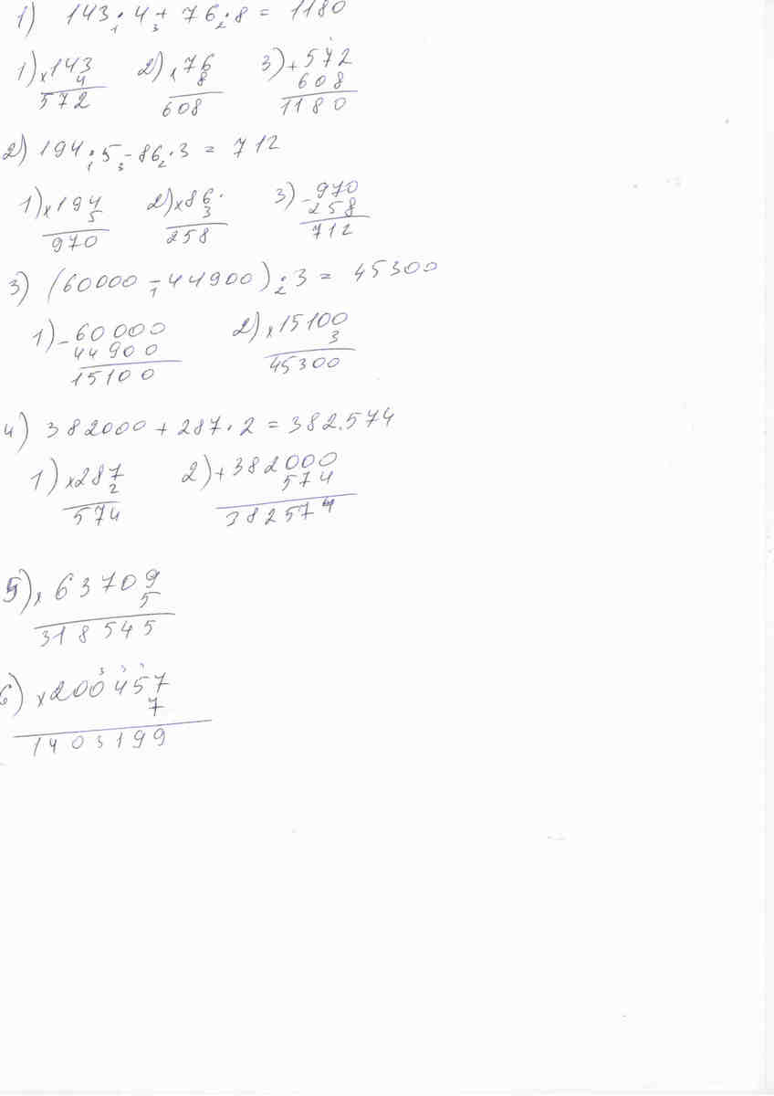 143*4+76*8= 194*5-86*3= (60000-44900)*3= 382000+287*2= 63709*5= 200457*7= столбиком!!! помогите пошалуйса буду благодарна за ранее спасибо