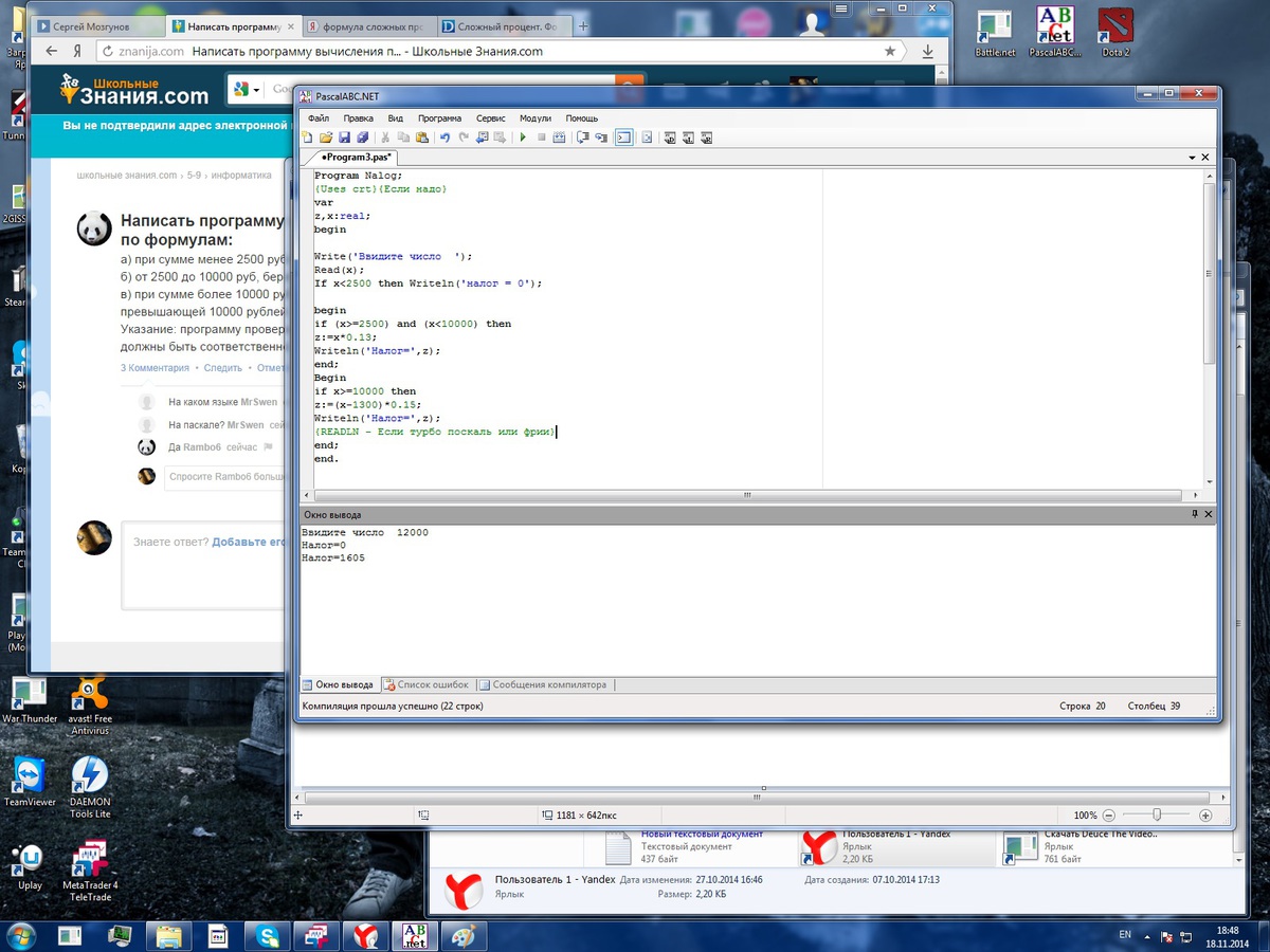 Указание: программу проверить при суммах 1000, 8000 и 12000 руб. Ответы должны быть соответственно 0, 1040 и 1600 руб. На паскале