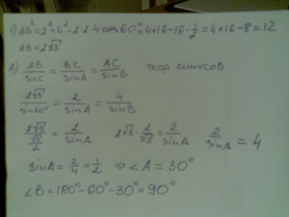 Треугольник АВС: Дано: АС=4(см); ВС=2(см); кут С =60 (градусов) Найти: кут В; кут А; ВА; (решить это с помощью теоремы косинусов или синусов) Решение: 1)за теоремою косинусов ВА(в квадрате)=2(в квадрате)+4(в квадрате)-2*2*4*соs60(градусов)=4+16-16*1/2(через дробь)=4*1/2=2(см) 2)sinВ=4*sin60/2(через дробь)=2 корень из 3( 3 под корнем) / 2 =корень из 3 3)sinА=? Проверьте пожалуйста РЕШЕНИЕ ,и как найти синус А ??? За ранее спасибо!!! Очень срочно надо!!!