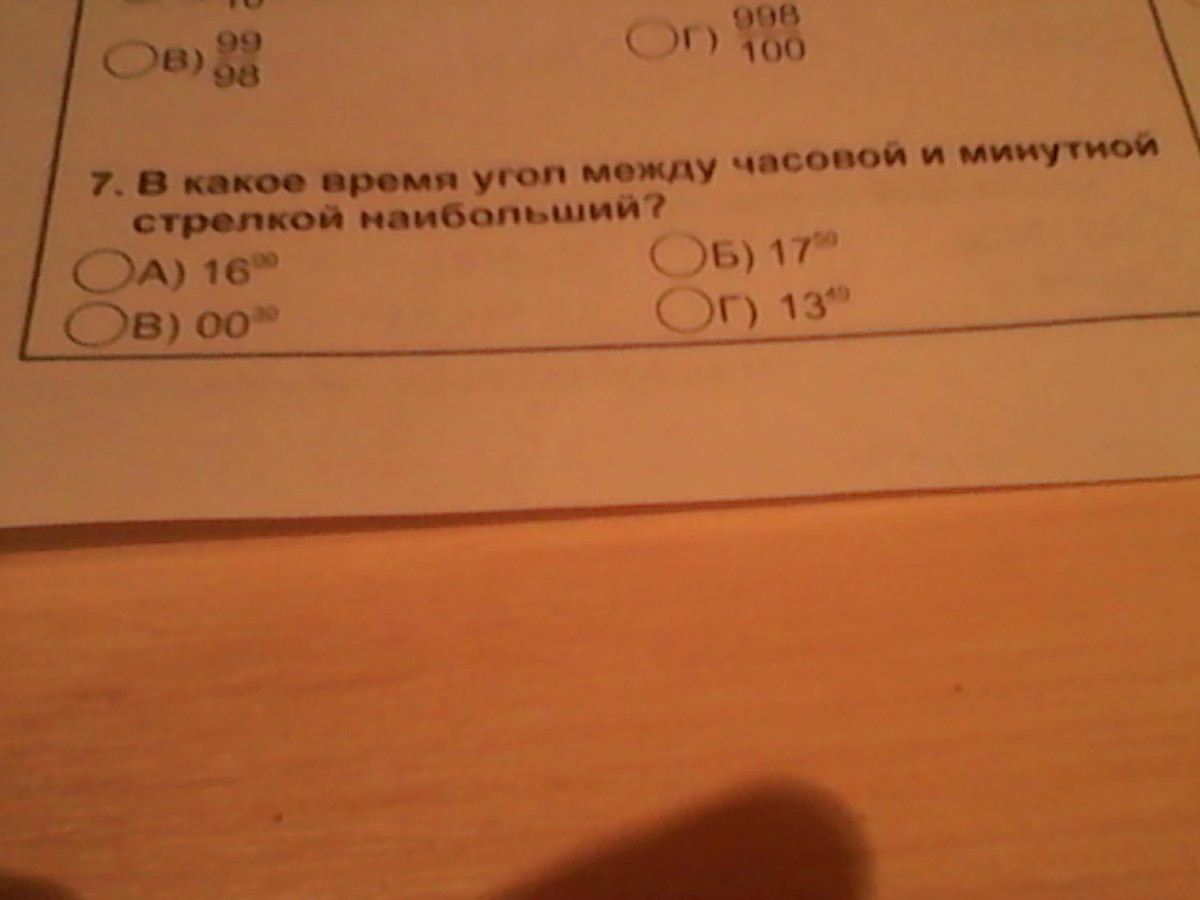 Ответ:17:50 угол между часовой и минутной стрелкой наибольший