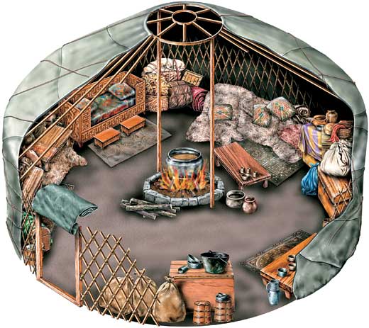 Бірінші суретте киіз үй бейнеленген. Киіз үйдін ішінде сандықтар,өрнектелген көрпелер, қазан, әр-түрлі ыдыс-аяқтар бейнеленген.